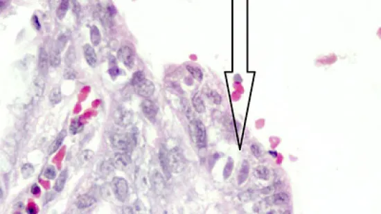 此腹泻仔猪的小肠粘膜中的生物体(箭头)是?
