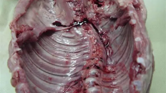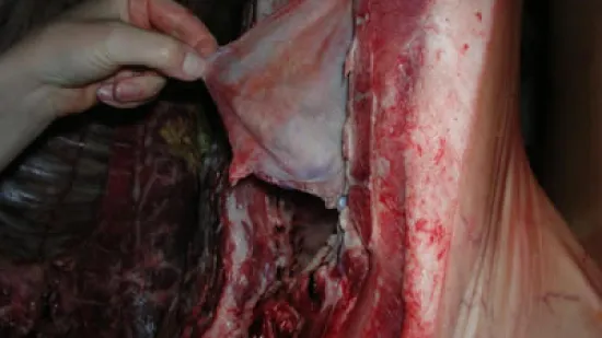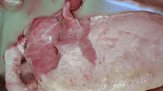 如图所示胴体被指存在心包炎。在你看来,正常的去除内脏的胴体应该是什么样的?