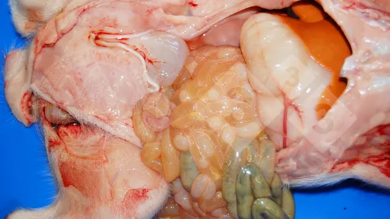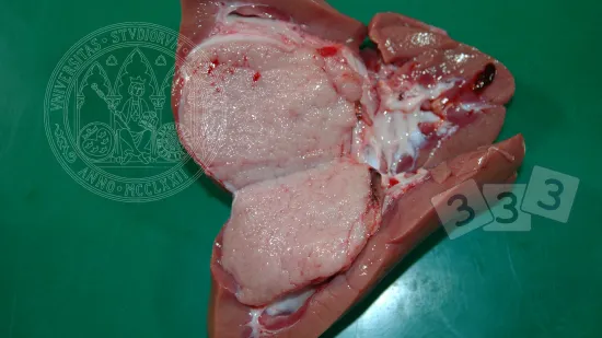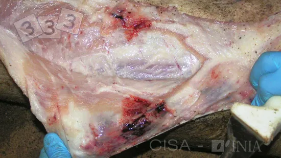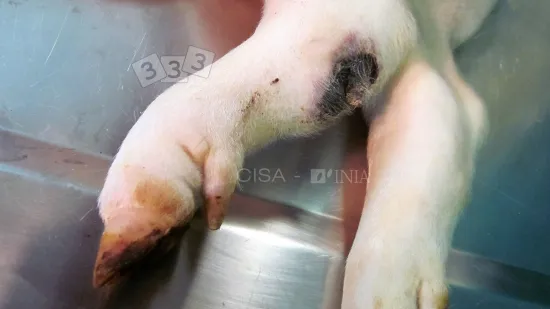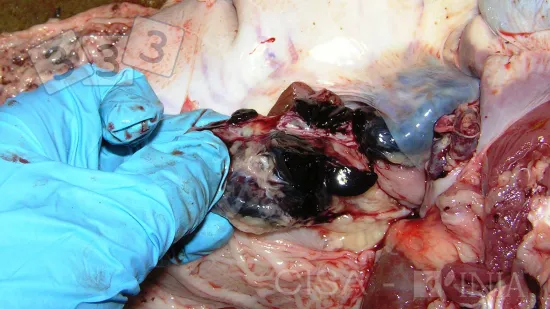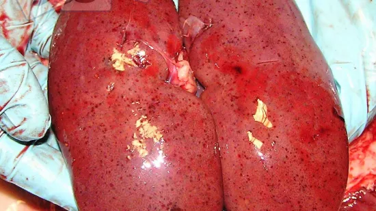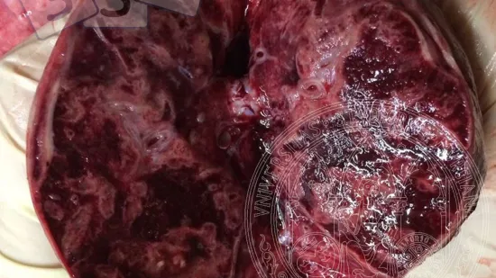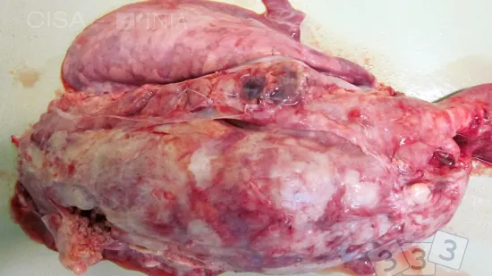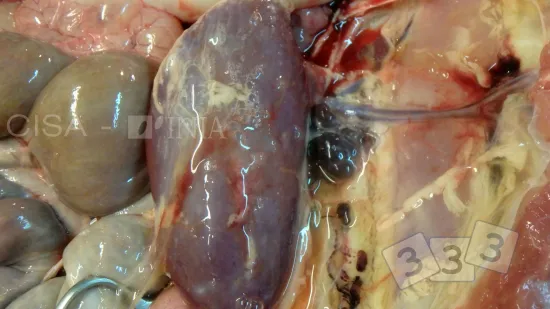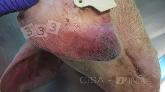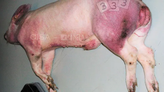 在一头出现发烧和嗜睡症状的猪的尸检中发现这种病变,可能原因是什么?
