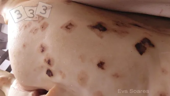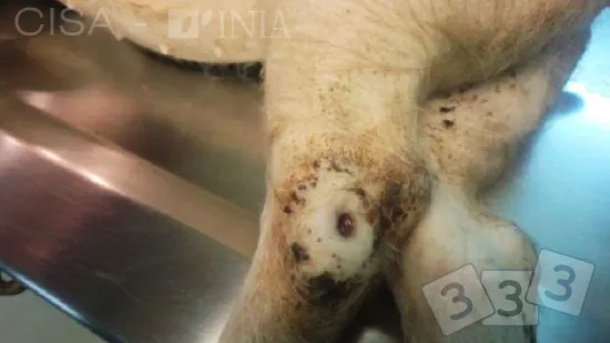 在屠宰场育肥猪皮肤上的斑点。最可能造成该病变的原因是什么?