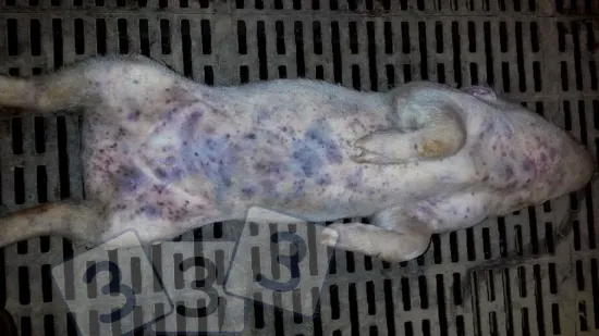 约15周龄的猪在后半身出现紫色斑块并延伸到全身。死亡率很高。造成这种病变的原因是什么?