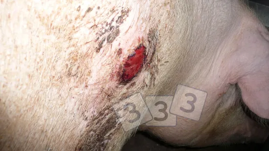 该母猪已经于2周前断奶,肩上出现这种病变。造成这种病变的最可能原因是什么?