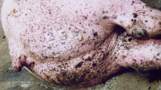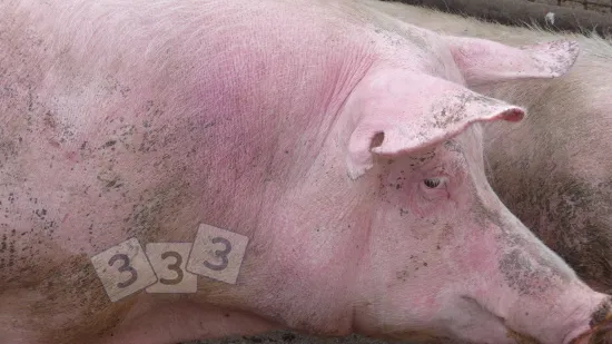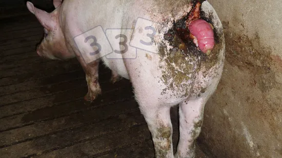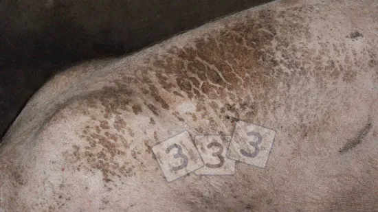 这头母猪背部的皮肤上有大片棕色鳞片。造成这种情况的原因是什么?