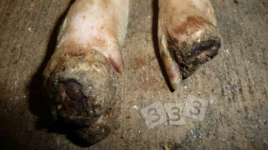 造成该断奶仔猪脚上坏死病变的最可能的原因是什么?