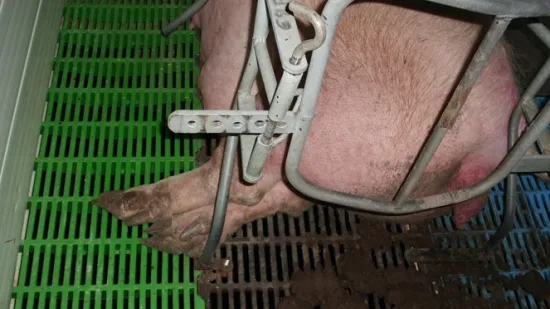 在这个限位栏中,板条平面低于通道,后门紧靠地面。 以下哪些评论是真实的?