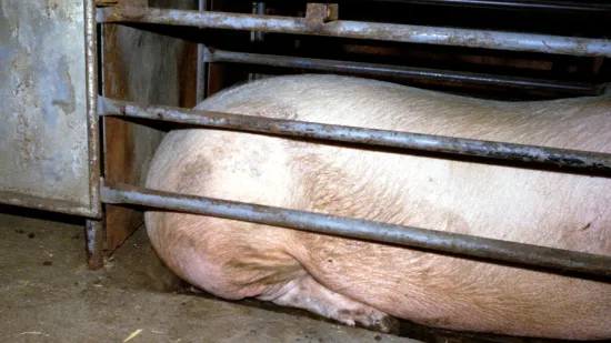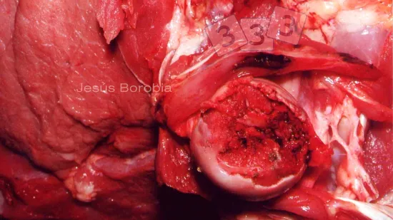在肛门下方后腿后面出现肿胀的猪的数量有所增加。它常出现于一侧。造成这种病变的最可能原因是什么?