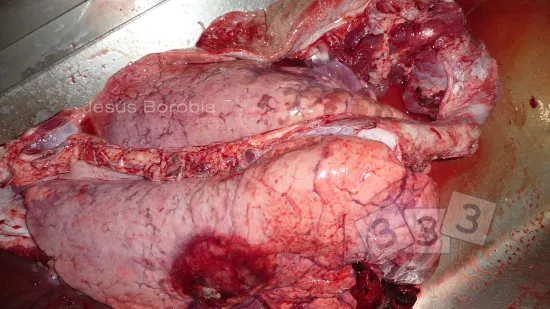 在15周龄直至育成猪中爆发疾病,表现为突然死亡,食欲不振,高烧,呼吸困难。 屠宰场检查发现肺部如该图所示。 最有可能的原因是什么?