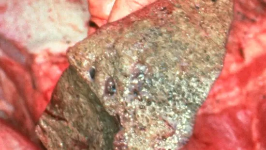 健康不良和缓慢的腹式呼吸的断奶仔猪数量增加。抗生素治疗效果差。死亡率为6-15%。造成这种病变的最可能原因是什么?