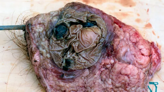 问:图示的溃疡位于成年公猪的包皮憩室,由于射精中的持续性出血被扑杀的。其可能的原因是什么?